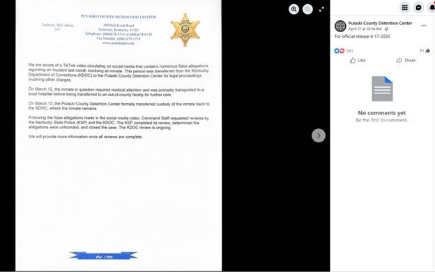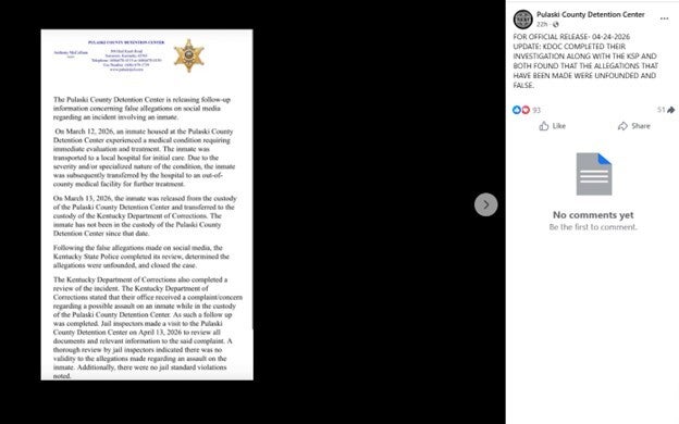 “The Kentucky Department of Corrections stated that their office received a complaint/concern regarding a possible assault on an inmate while in the custody of Pulaski County Detention Center. As such a follow up was completed. Jail inspectors made a visit to the Pulaski County Detention Center on April 13, 2026, to review all documents and relevant information to the said complaint. A thorough review by jail inspectors indicated that there was no validity to the allegations made regarding an assault on the inmate. Additionally, there were no jail standard violations noted.” Again, the inmate the detention center is referring to is not referenced in the official statements.