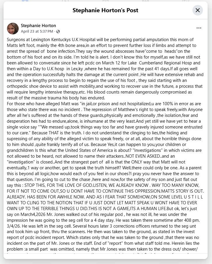 In addition to official statements released by the Pulaski County Detention Center, a family member of an inmate has made a public social media post describing a serious medical condition requiring extended hospitalization, including a reported partial amputation. These claims raise concerns about possible mistreatment while in custody; however, they have not been independently verified through records, official reports, direct interviews, or court filings. *Screenshot attached